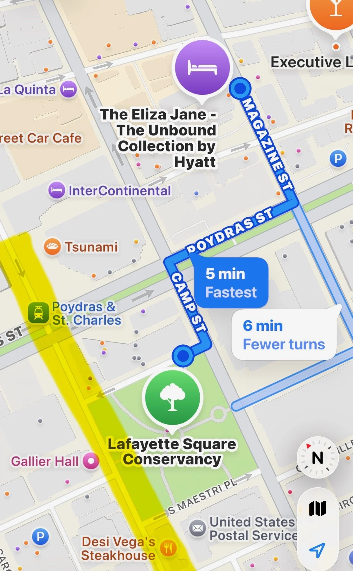The Eliza Jane is a 5 minute walk to the area we like best for watching the parades. The parade route runs along Saint Charles Ave. (the highlighted area on the map). The street directly in front of the park is blocked with bandstands but the two intersections are available for people to set up their chairs. We prefer the intersection with S. Maestri but both intersections are great locations.