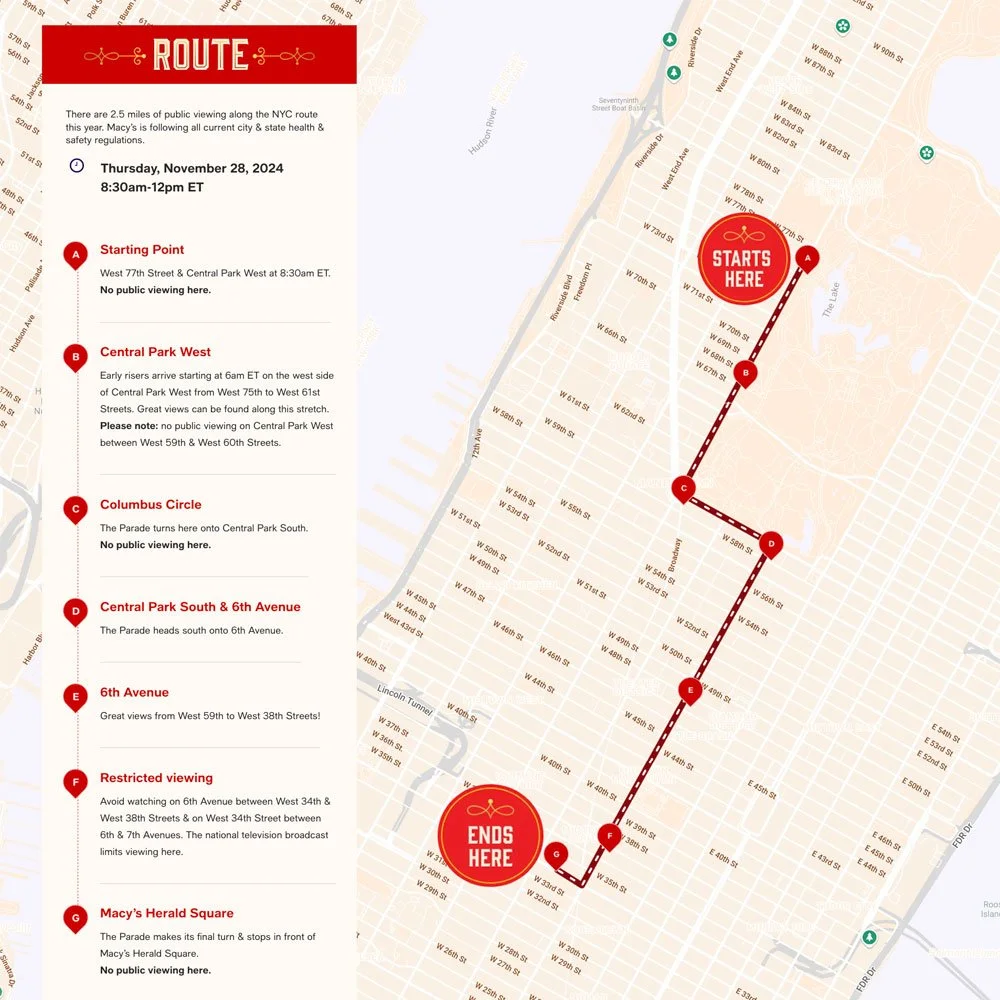 Fortunately, there are two Hyatt hotels about a block away from the parade route - the Park Hyatt New York and the Thompson Central Park New York. When looking at the parade map to the right, both hotels are very close to letter “D” where the parade turns from 59th Street (in front of Central Park) onto 6th Avenue.